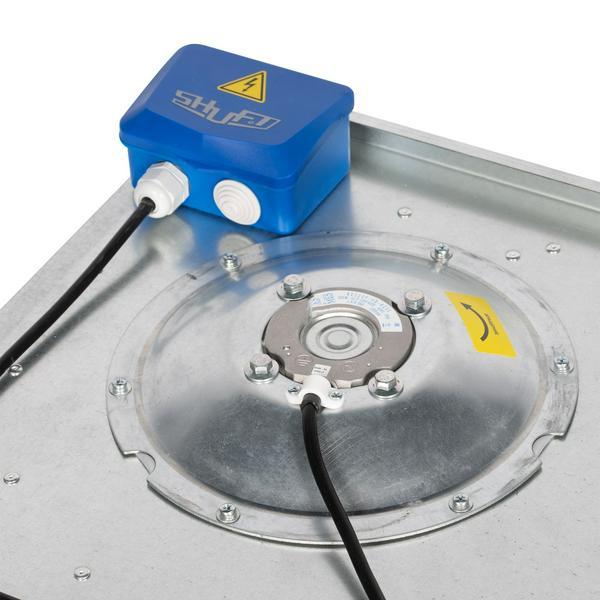 Корпус вентиляторов серии RF VIM изготовлен из оцинкованной стали. Вентиляторы оборудованы высокоэффективной крыльчаткой с вперед загнутыми лопатками и асинхронным двигателем с внешним ротором IP54, клеммная коробка IP55. Рабочее колесо установлено методом напрессовки непосредственно на ротор электродвигателя. Электродвигатель с рабочим колесом статически и динамически сбалансированы в двух плоскостях. Шариковые подшипники двигателя не требуют техобслуживания. Защита двигателя вентилятора осуществляется встроенными термо-контактами, требующими подключения внешнего защитного термореле. В случае применения пятиступенчатых регуляторов скорости TRE-T и TRD-T дополнительное защитное термореле не нужно. Регулирование скорости вентилятора осуществляется путем изменения напряжения за счет использования пятиступенчатых трансформаторов TRE-T, TRD-T или однофазных плавных регуляторов скорости SRE. При использовании частотных преобразователей следует обеспечить синусоидальную форму сигнала (между преобразователем и двигателем должен устанавливаться фильтр).