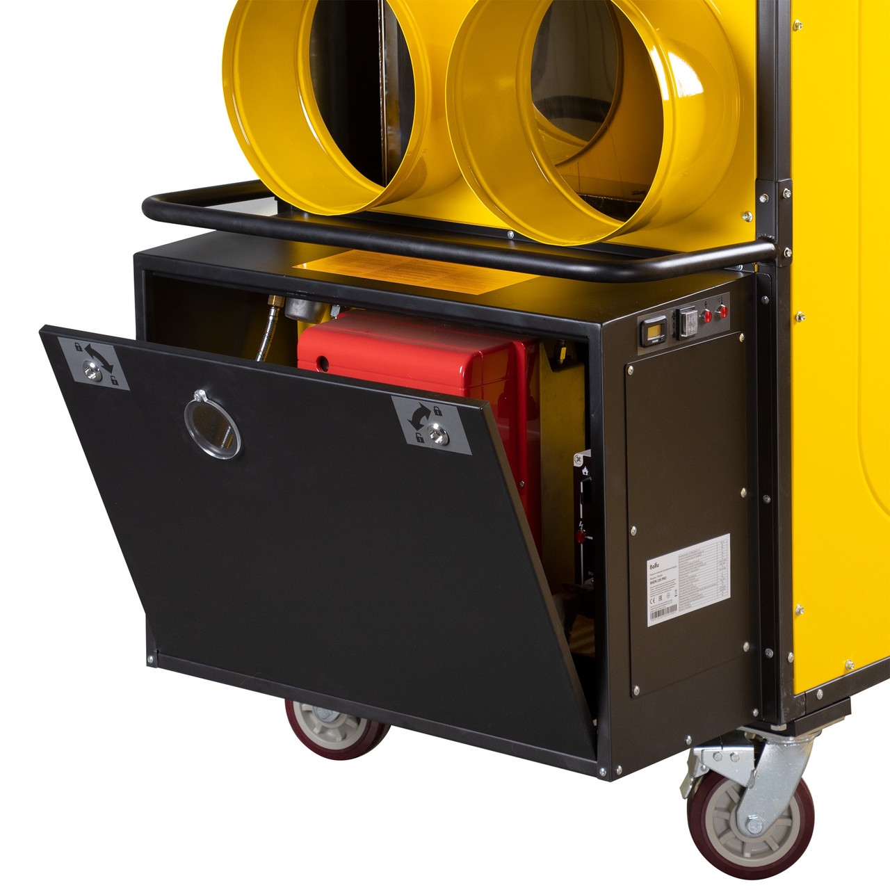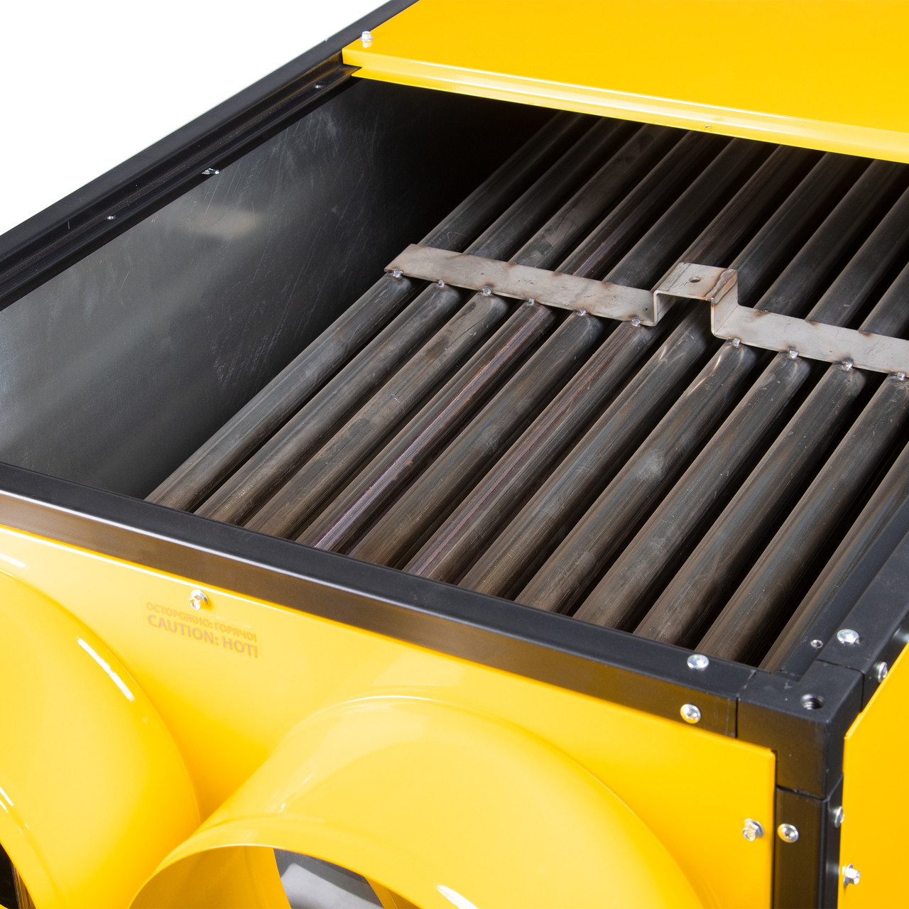 В результате сгорания дизельного топлива вырабатывается тепло, которое через металлические стенки камеры сгорания и широкого теплообменника передается воздуху, втягиваемому вентилятором производительностью 14000 м3/ч. Нагретый воздух выбрасывается наружу через выпускную трубу, а дым с продуктами сгорания выводятся через отверстие дымохода.