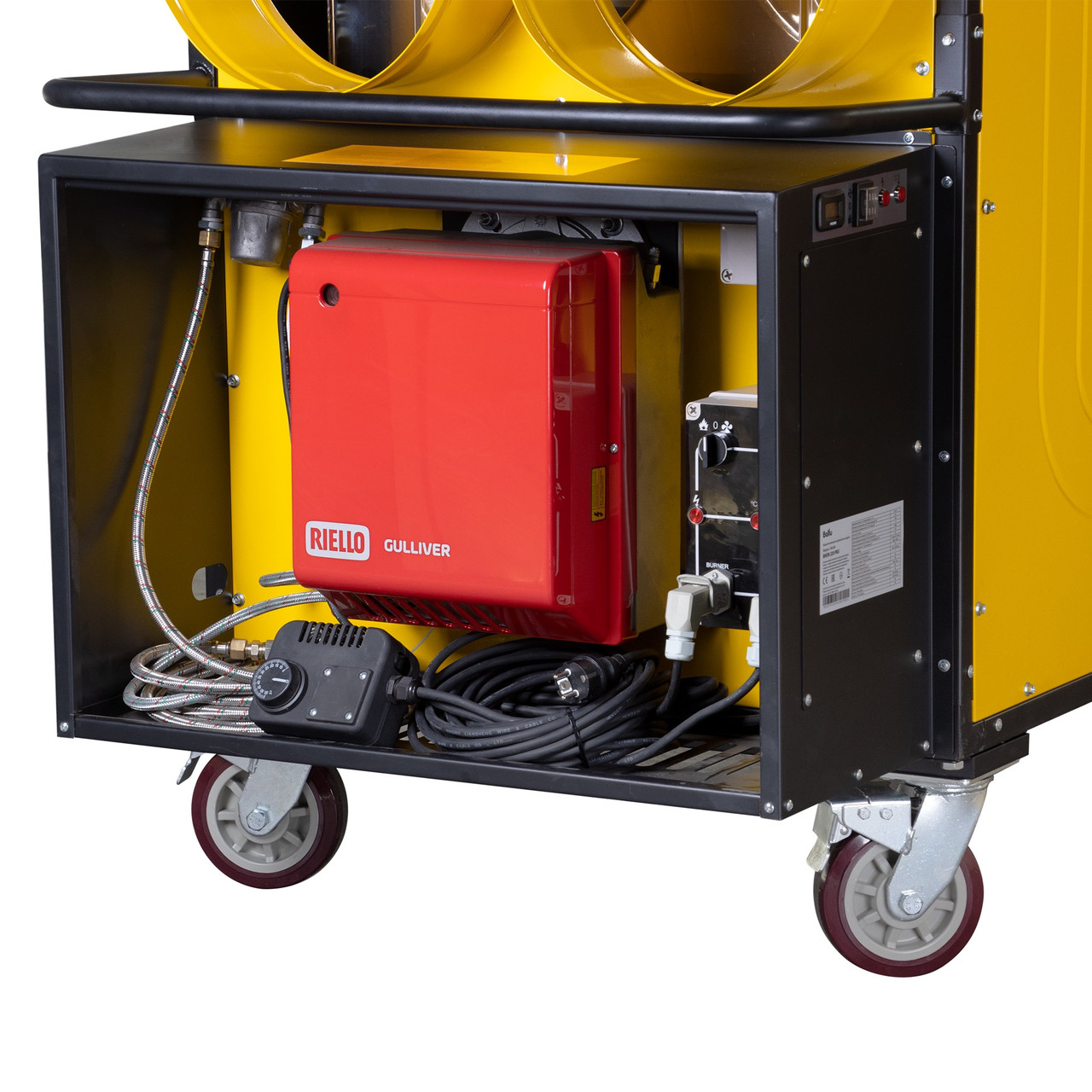 Вентилятор продолжает работать после выключения теплогенератора некоторое время, охлаждая камеру сгорания и корпус теплообменника, тем самым предотвращая деформацию теплообменника. Топливный фильтр продлевает работу форсунки и обеспечивает бесперебойную работу при условии использования качественного дизельного топлива. Металлический шкаф для горелки и электронного блока имеет уровень пыле- и влагозащиты IP 44. Термоконтроллер в комплектации позволяет поддерживать установленную температуру в обогреваемом помещении.